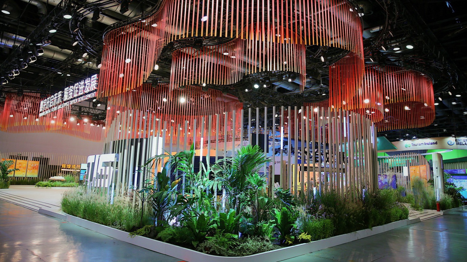 一簇簇的毛毛草环绕,淡蓝、浅粉色的绣球花朵点缀其中,叶片宽大的绿植与灌木交错种植……当走入服贸成就展展区时,展区内处处见绿的景观小品让人感觉像走进了一座大花园。