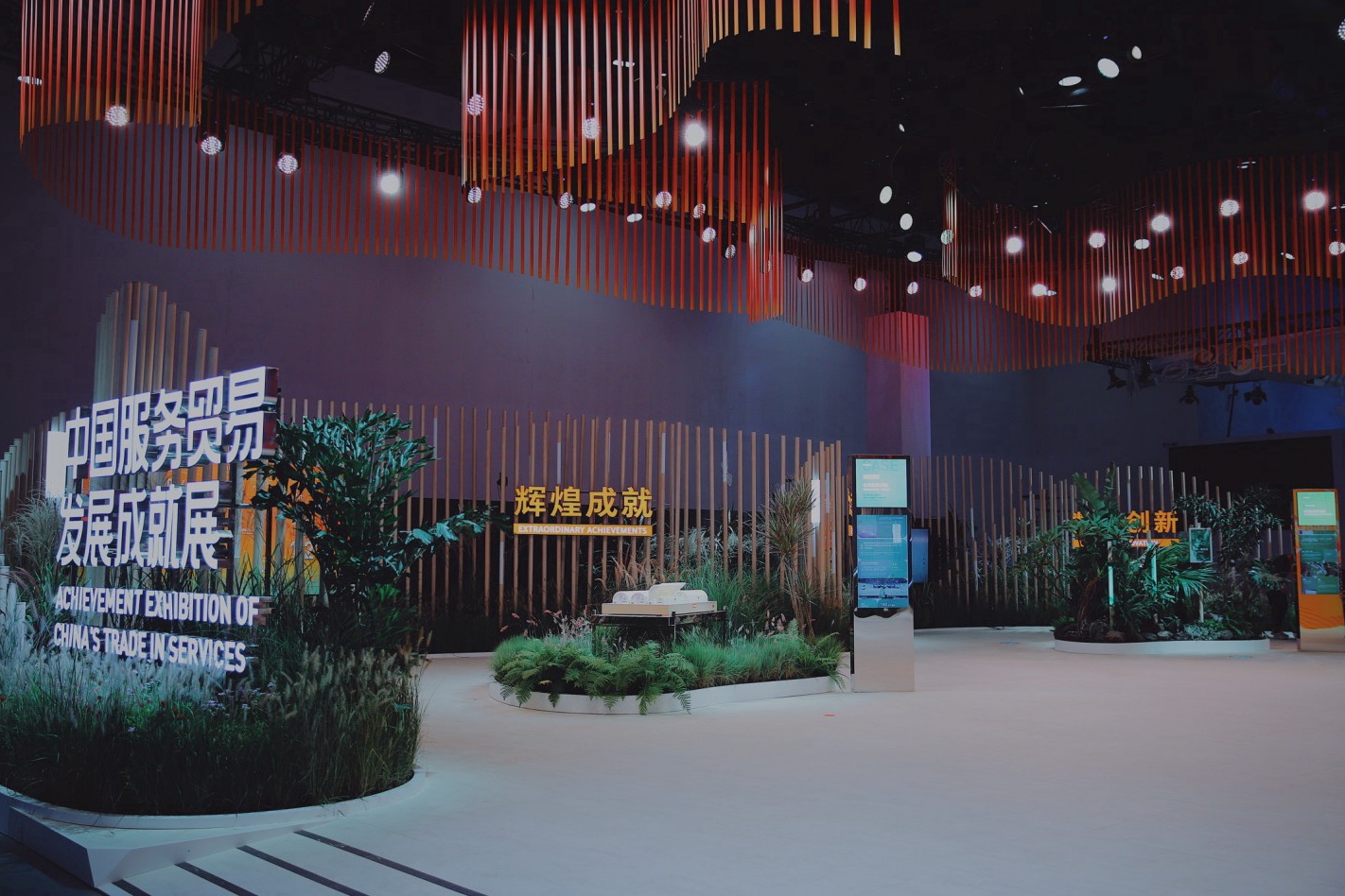 “打造沉浸式服贸花园,正是我们在成就展展区体现的设计理念。”负责本届服贸会展区设计工作的北京城建设计发展集团新文创策略研究中心主任程璐告诉记者,成就展采用自然造景手法打造了“辉煌成就、数字创新、开放合作、互惠共享”四个服务贸易主题沉浸式数字花园。值得一提的是,展区内90%以上的搭建材料都可实现回收再利用,是助力实现“双碳”行动的绿色展厅。