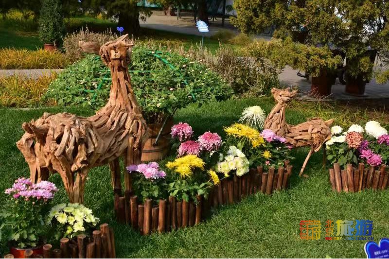 以“咏菊”为主题的菊颂悠然展棚,则以木牛、柴门、篱笆、花窗等为元素,配搭悬崖菊绑扎的葫芦、品种菊、多头菊等,构成了一幅“采菊东篱下”的画面。步入式的摆放形式,让视野延伸,与背景中的远山、茅屋相映成趣,形成“悠然见南山”的田园景色。