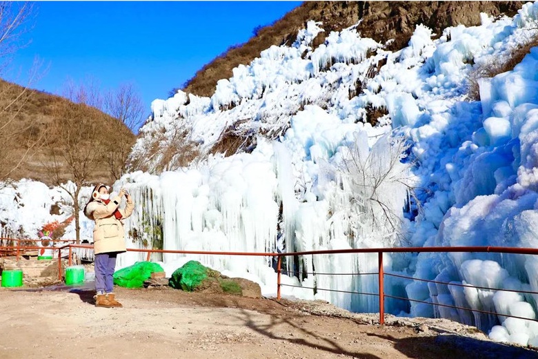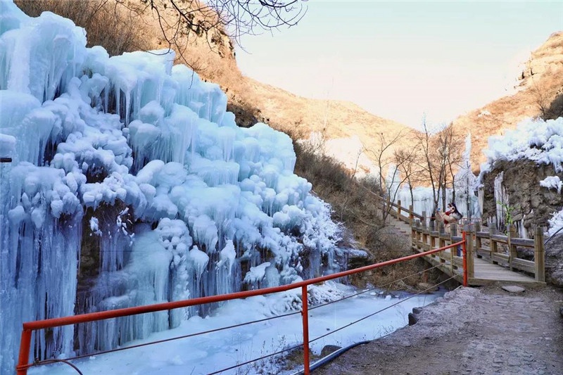 往日流水潺潺的河溪凝结成洁白的“玉带”,再加上人工的精心雕琢,浏览路上一步一景,让人频频驻足。