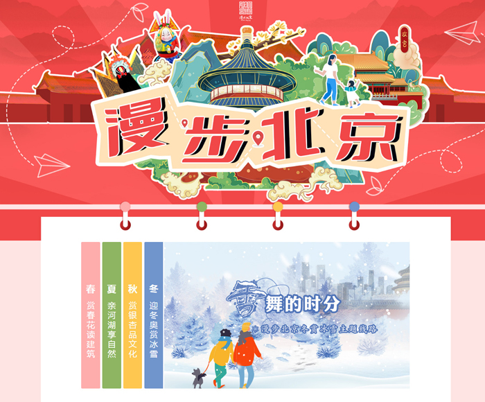 2021年,北京市文旅局推出“漫步北京”系列主题游线路,春、夏、秋、冬四季,春季“赏春花读建筑”,夏季“亲河湖享自然”,秋季“赏银杏品文化”,冬季“迎冬奥赏冰雪”,为广大市民游客提供了可聆听的历史文化之旅,可回味的都市休闲之旅。