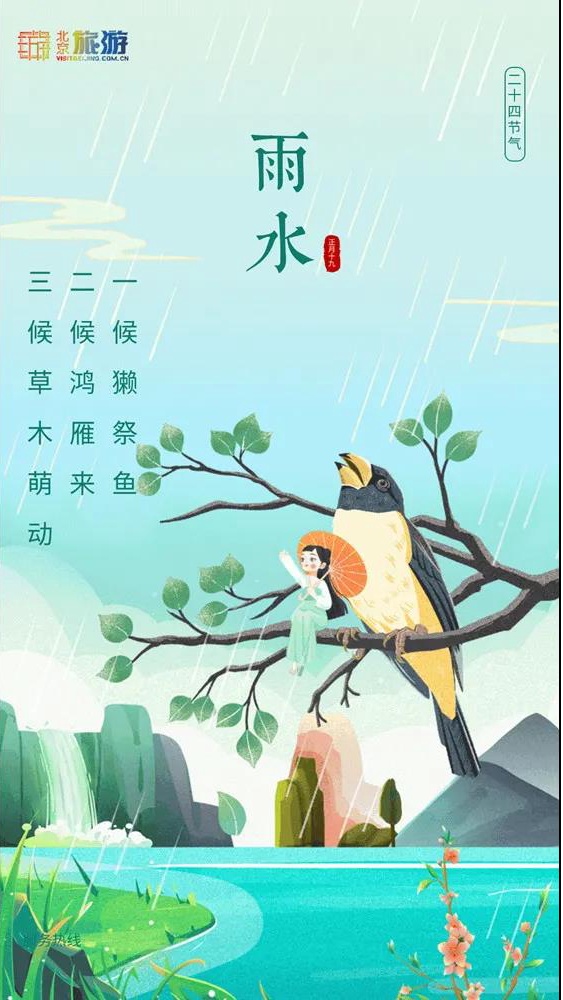 雨水是24节气中的第2个节气。此时,气温回升,冰雪融化,降水增多,万物开始萌动,春天就要到了。