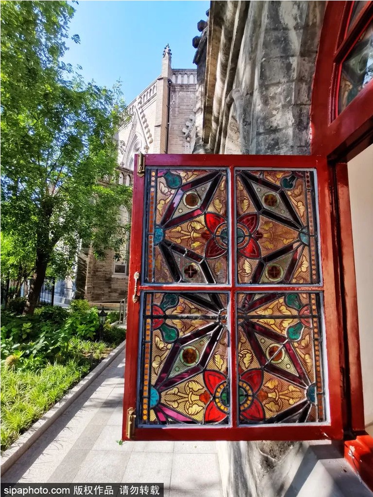 教堂白色大理石壁与红色木门,掩映在苍松翠柏之后,待到4月份,海棠花开满枝头,青粉相间,色彩明快淡雅。在这里拍照打卡,好似人在画中游。