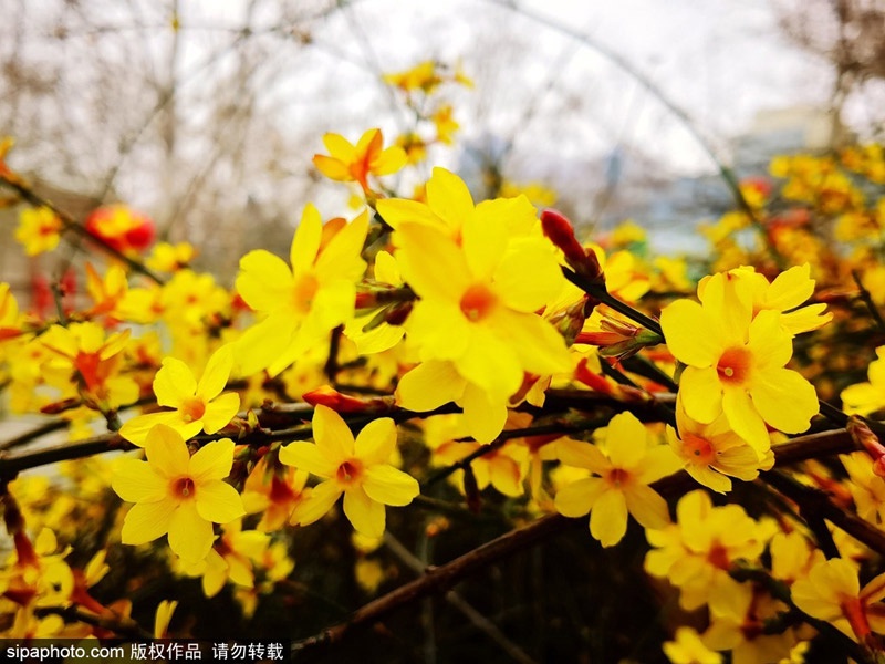 迎春花又名黄素馨、金腰带,在我国已有1000多年栽培历史。落叶灌木丛生,小枝细长直立或拱形下垂,呈纷披状。3小叶复叶交互对生,叶卵形至矩圆形。花单生在去年生的枝条上,先于叶开放,有清香,金黄色,外染红晕。