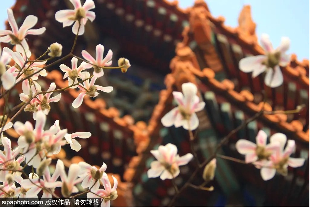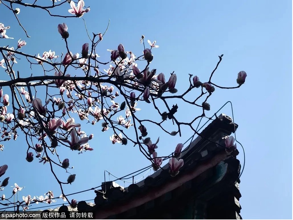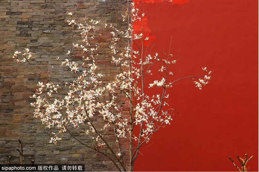 红墙黄瓦映衬着洁白和粉嫩的玉兰,别有一番韵味。其中有一颗玉兰处在红墙与青砖中间,画面别有一番风味,吸引了众多市民、游客和摄影爱好者拍照留念。