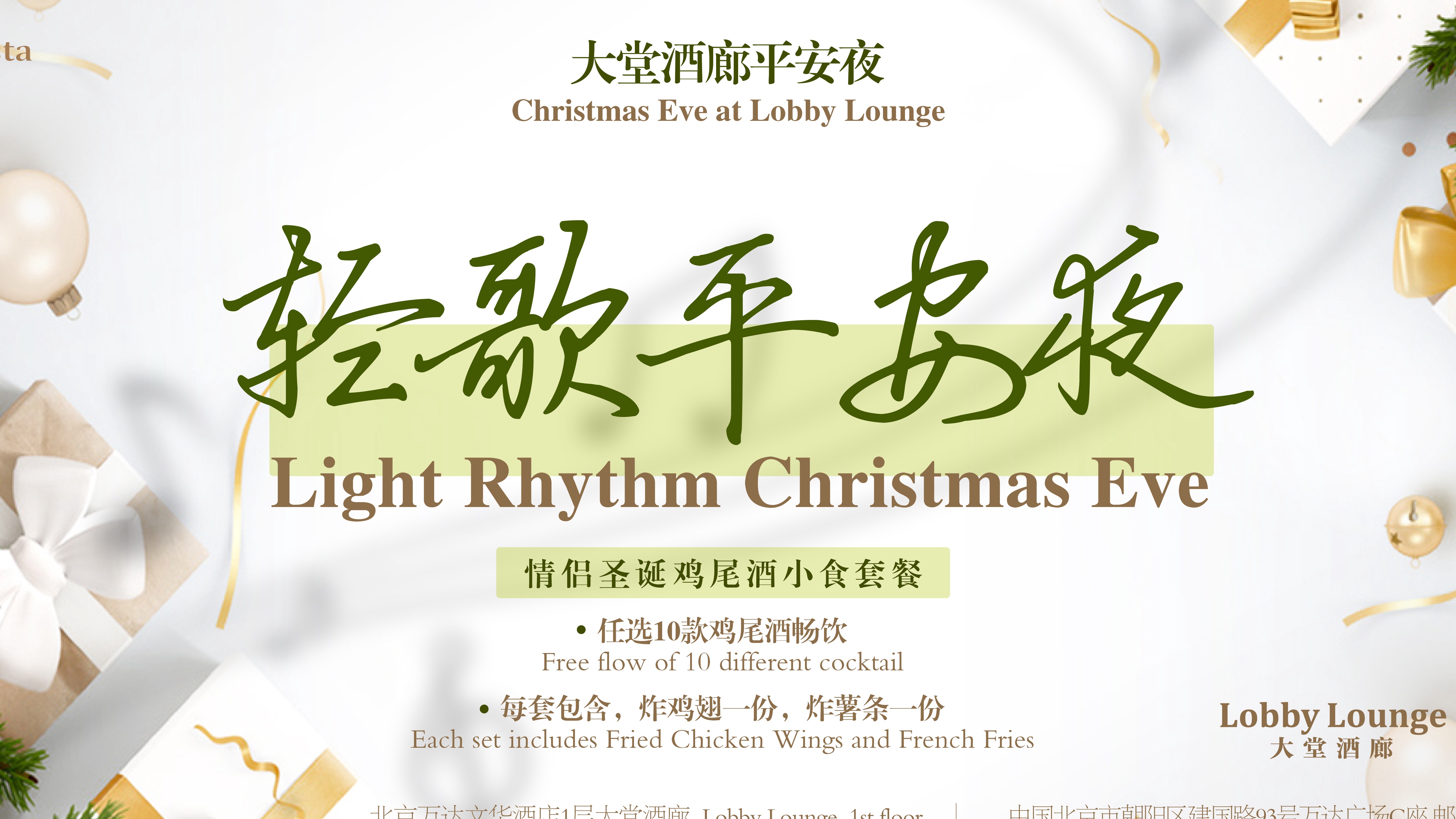 美食汇平安夜自助晚餐:徜徉于各式海鲜餐台、日式料理台、冷切肉餐台、丰盛牛扒烧烤档口;龙虾、吉拉多生蚝、大虾、帝王蟹腿、扇贝、青口;刺身寿司、西班牙海鲜饭、印度特色菜、琳琅满目的甜品,无限量畅饮红白葡萄酒、果汁,来一场舌尖盛宴吧!每位人民币488元,一家三口过圣诞,即享人民币788元!电话: 010 8599 6666 转6520。大堂酒廊轻歌平安夜 : 在充满曼妙风情的大堂酒廊,伴随着轻快的歌曲,品味为您特调圣诞专属鸡尾酒。任选10款鸡尾酒畅饮,再配上一份炸鸡翅和薯条,让您尽兴过圣诞。