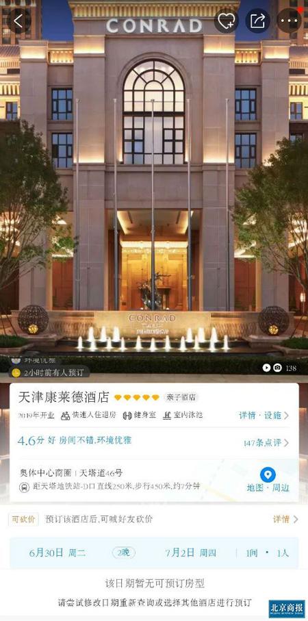 北京商报讯(记者 关子辰 杨卉)6月17日晚间,北京商报记者发现,天津康莱德酒店客房、餐饮均无法预订。随后北京商报记者致电该酒店,酒店工作人员表示,目前接到通知,该酒店已暂停营业。目前,天津康莱德酒店在美团平台显示为暂停营业,而携程平台也无法预订房间。