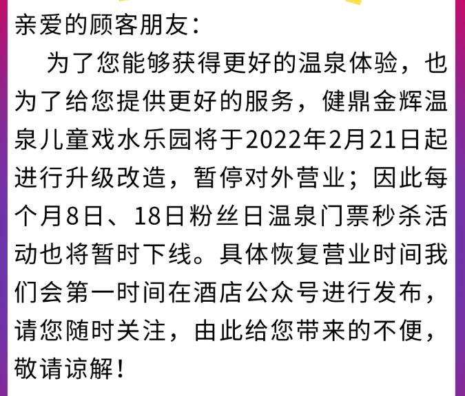 通知:关于健鼎金辉温泉儿童戏水乐园升级改造停业的通知!