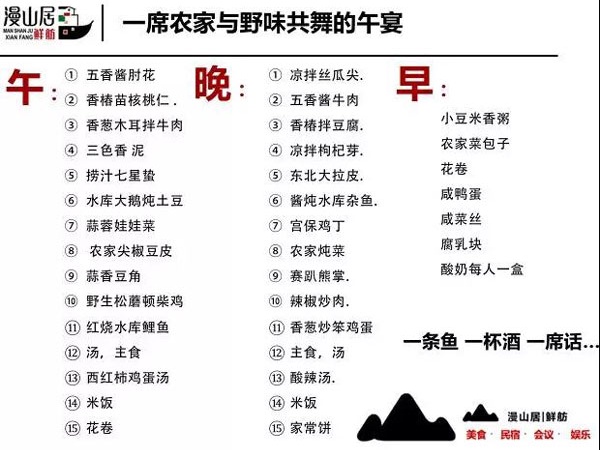 漫山居居主先生最近非常潮,他有句口头禅:“只要不是抑郁症,每个人都应该有一颗骚动的心。”仰着头望着水库上空的繁星,闻着水库的蛙鸣与凉爽的风,空气中弥漫着烧烤与啤酒的芳香。居主认为:这两年钱不好赚,尤其是创业企业。基于此漫山居将在周一至周五针对团建类客户推出一个周期性活动,这个活动将助力于中小微企业及精英团队的发展,让他们感受漫山居真挚的诚意,以最具性价比的方式提供最好的团队建设场所。