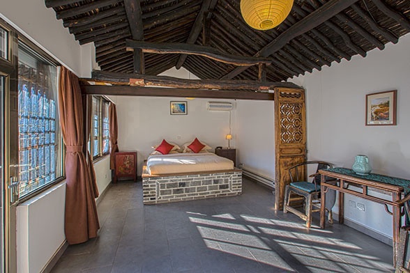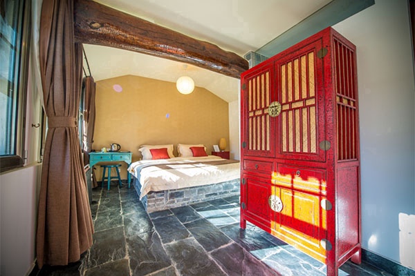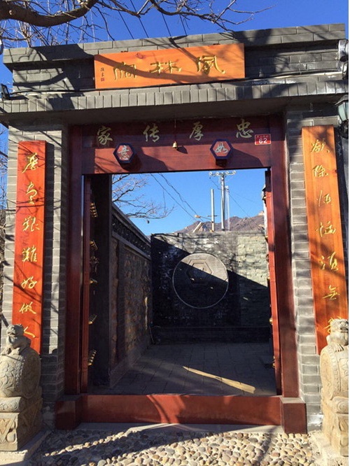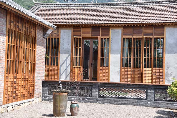 外部均保留着原有的古风古貌,木门、木窗、椽子、石磨呈现出时间的印记;内部则是传统古朴的装修风格,木门木窗加衬玻璃,青石铺地,安装了地暖设施以及麦秸秆取暖锅炉等。