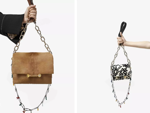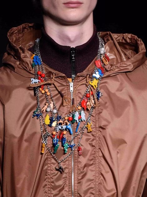 除了成衣,他的创意还延伸至配饰上,Marni配饰系列包括一系列项链和手链,上面饰有体现Frank Navin设计的充满想象力的彩色吊坠。