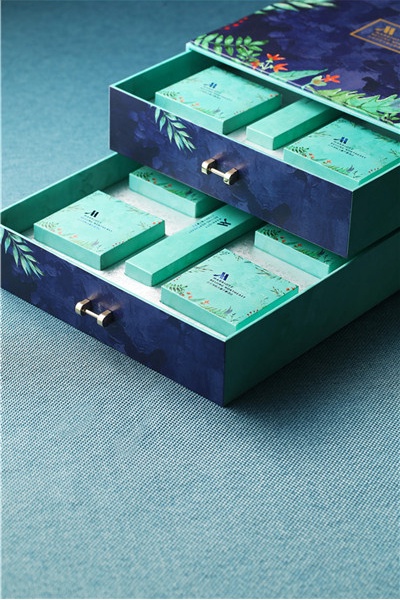 蓝庭·月饼礼盒及轩庭·月饼礼盒——上下双层屉式设计,古典柔美的花纹搭配青蓝色的晕染,高雅精致尽显。