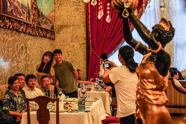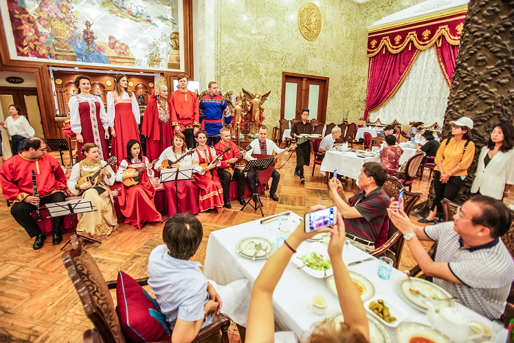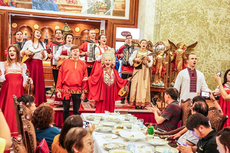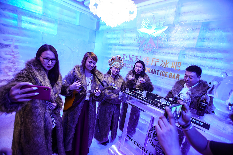 再往前走几步,耳边的摇滚乐变成了悠扬的俄罗斯民谣。婚庆小广场是拍照片的好地方,流光溢彩的灯光照在了俄式建筑的白墙上。虽然是工作日,广场对面的莫斯科餐厅内依然坐满了顾客,奶汁海鲈鱼、土豆沙拉、红菜汤等一道道传统俄式佳肴陈列。“到了周末的夜间常常排号一二百位,一些顾客也会选择到旁边的小莫餐厅用餐。”餐厅服务员说。门口大堂内,面包柜台和冰吧前排起了长队。“来试一试在冰天雪地的环境里,品尝我们最爱的鱼子酱和伏特加?”俄罗斯工作人员微笑地和顾客介绍着,满口流利的中国话。