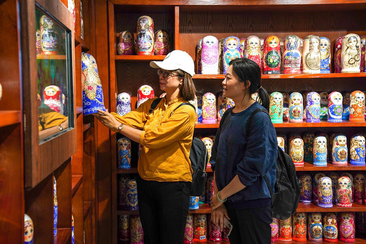 店员介绍,今年夏天起,“俄优品”的营业时间全面配合夜间演出时间,原定的晚九时闭店时间延长至半夜,方便看完演出想购物的观众。每逢周末,户外还举办“夜间集市”。