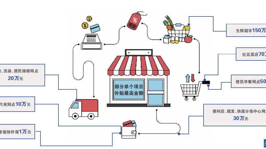 《通知》中提到,对营业执照取得日期在2019年1月1日(含)以后的新建连锁直营便民商业网点(设施),给予店面装修、硬件设备购置、房屋租金等费用支持,其中单个生鲜超市补助金额最高不超过150万元,单个社区菜店补助金额最高不超过70万元,单个便民早餐网点补助金额最高不超过50万元,单个便利店、理发、快递分拣中心网点补助金额最高不超过30万元,单个家政、洗染、便民维修网点补助金额最高不超过20万元,单个洗衣代收网点补助金额最高不超过10万元,每组智能快件箱补助金额不超过1万元。