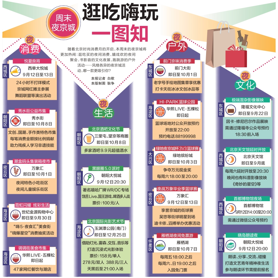 随着北京时尚消费月的开启,周末的夜京城将更加热闹:逛吃买的夜间消费,嬉戏欢的夜间聚会,书影音的文化夜展,跑跳游的户外活动……风格各异的夜京城活动,哪一款更吸引你?本报记者 白歌 本版制图 耿争