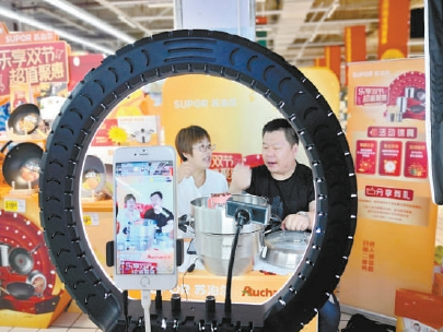 日前,在西四环欧尚购物中心厨具柜台前,两名售货员“粉墨登场”,用新颖的视频直播方式进行“双节”前的炊具促销活动,吸引了众多顾客。本报特约摄影 樊甲山