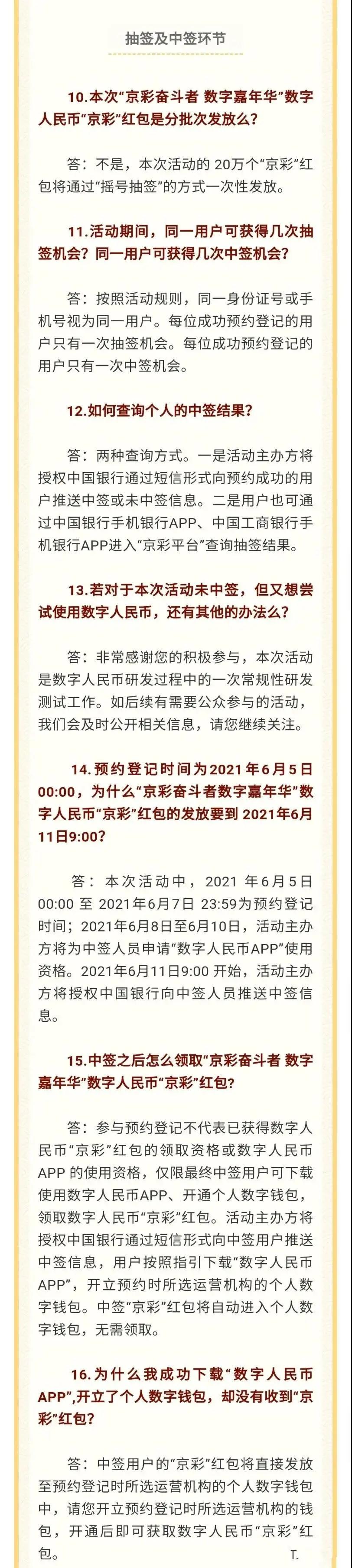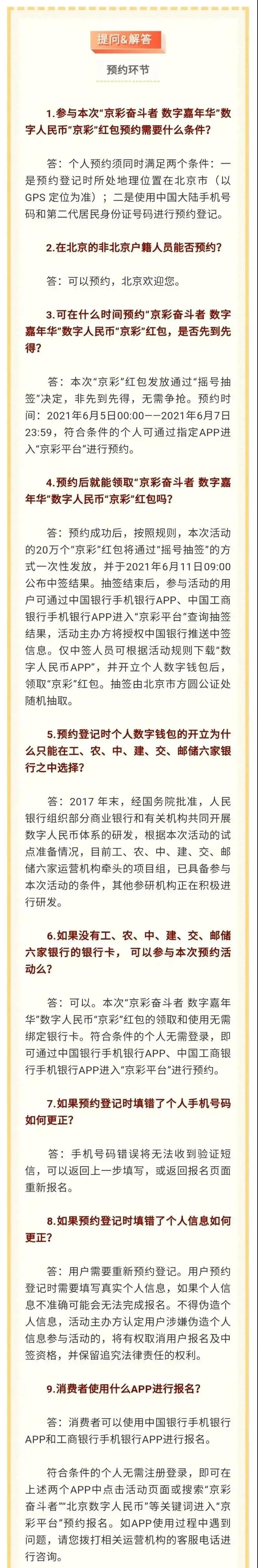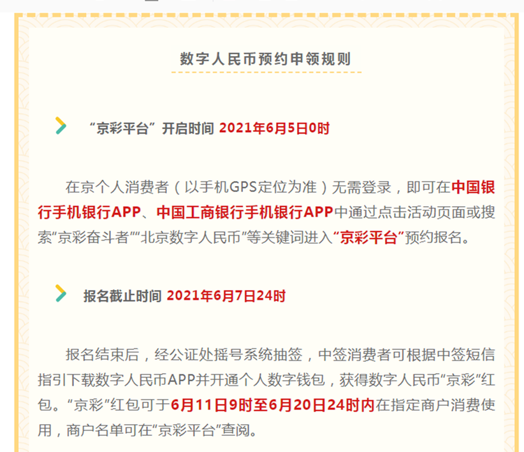 6月5号零点起,在京个人消费者无需登录,即可在中国银行手机银行APP、中国工商银行手机银行APP中通过点击活动页面或搜索“京彩奋斗者”“北京数字人民币”等关键词进入“京彩平台”预约报名。报名截止时间为6月7号24点。报名结束后,经公证处摇号系统抽签,中签消费者可以根据中签短信指引下载数字人民币APP并开通个人数字钱包,获得数字人民币“京彩”红包。“京彩”红包6月11号9点到6月20号24点内可以在指定商户消费使用,商户名单可在“京彩平台”查阅。