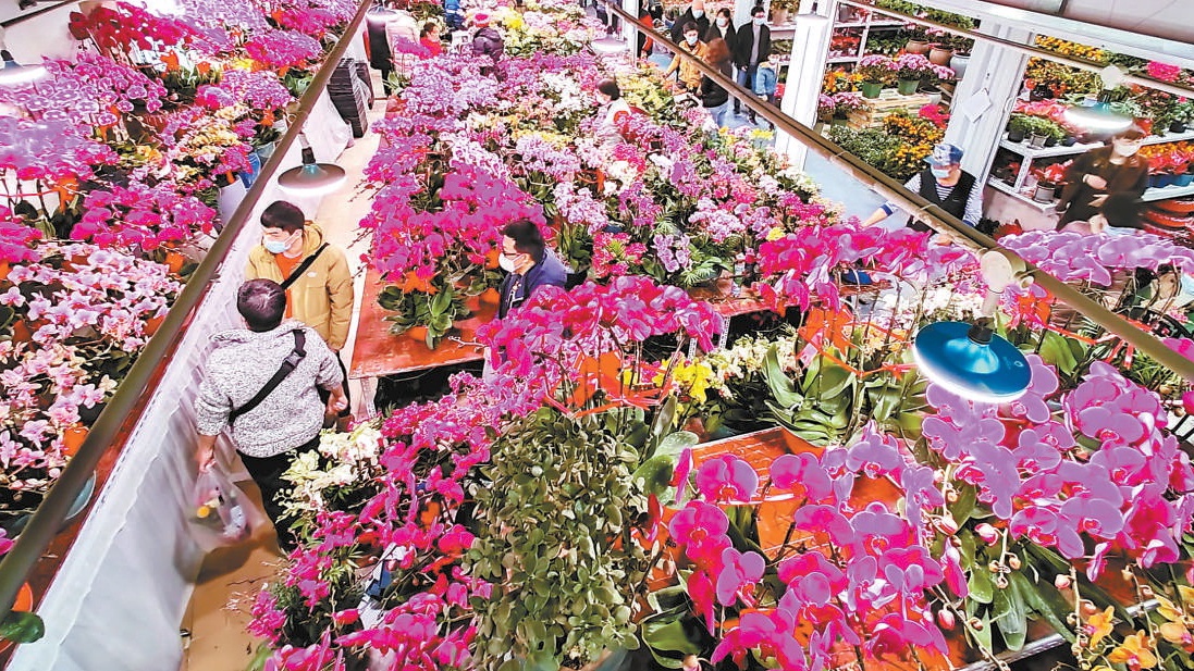 春节临近,年宵花热销。记者走访发现,线下花卉市场和线上生鲜平台均已上架年宵花,受到消费者欢迎。图为顾客们在黄土岗花卉市场选购心仪的年宵花。