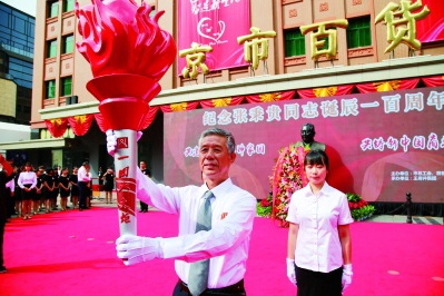 在王府井集团最为熟悉的“你是一团火,我是一团火”歌声中,“一团火”火炬传递仪式开始。鲜红的“一团火”火炬在王府井集团经营涉及的时尚百货、购物中心、奥特莱斯、生活超市四大业态公司代表、北京地区门店员工代表以及东城区劳模代表、首旅集团大工匠代表手中依次传递。