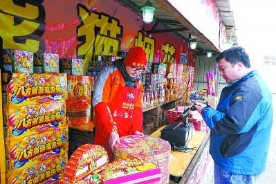 上午10时许,记者在位于朝阳区三间房的一家烟花爆竹销售点看到,不少路过的市民都被红彤彤的喜庆花炮吸引过来。“过年不就图个热闹的年味儿嘛!买几挂给孩子玩儿。”家住附近的吴大爷带着外孙女前来采购。