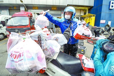 3月3日,在朝阳区民族园某超市外卖配货区,数十名外卖员正在紧张配货。疫情发生后,许多市民选择在家订购食材自己烹饪,生鲜类订单大幅增长。饿了么外卖平台负责人介绍,北京区域的生鲜商超订单同比增长超9成。本报记者 潘之望摄