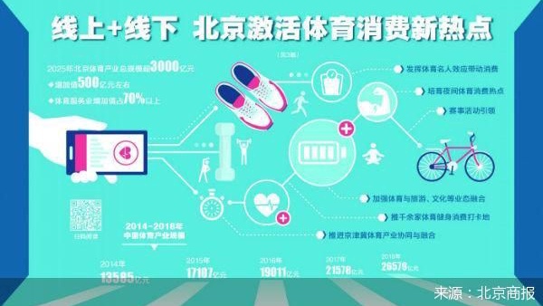 2018年,我国体育产业总规模已超过2.6万亿元,行业预测,2020年全国体育产业总规模将超过3万亿元。根据北京市的规划,2020年,北京体育产业规模将达到1500亿元;2025年北京体育产业总规模将超过3000亿元,实现增加值500亿元左右,体育服务业增加值占体育产业增加值的比重达到70%以上。