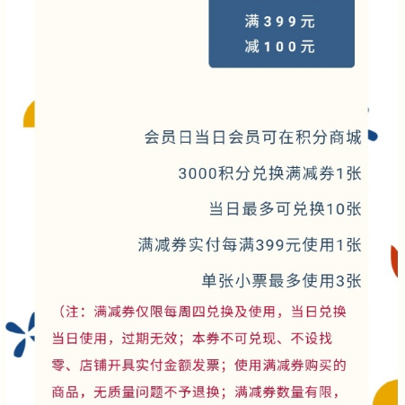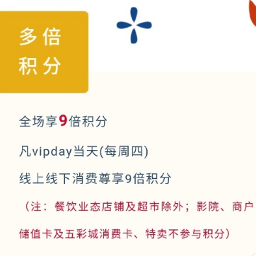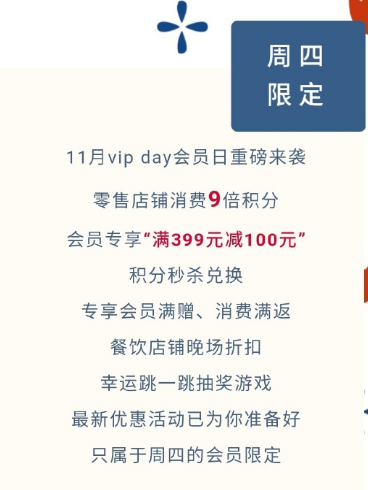 11月vip day会员日重磅来袭,零售店铺消费9倍积分,会员专享“满399元减100元”,积分秒杀兑换,消费满返、幸运抽奖游戏,快来接收只属于周四的会员限定!