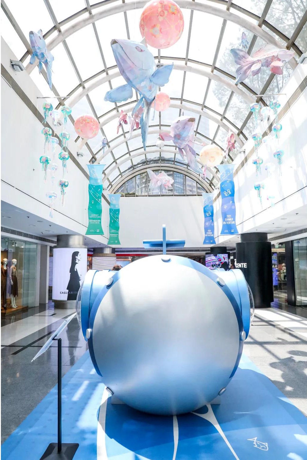 跟随一艘宝蓝色的潜水艇,探索海洋生物、海洋生态文明。近些年来人类对海洋的垃圾污染逐渐得到大众关注,潜水艇中的“宝藏”就是UMMM设计工作室用海洋垃圾解构重塑而成,巧妙又环保。