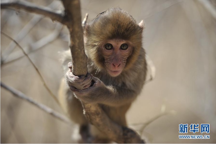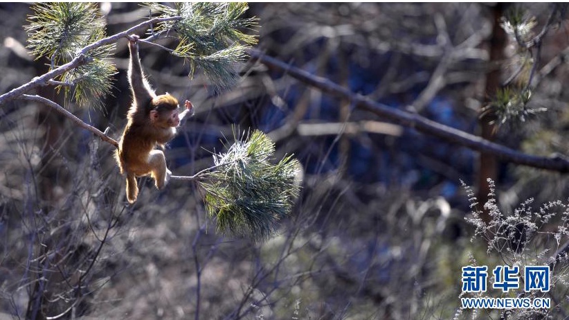 1月5日,在双滦区双塔山景区,一只猕猴在树上玩耍。