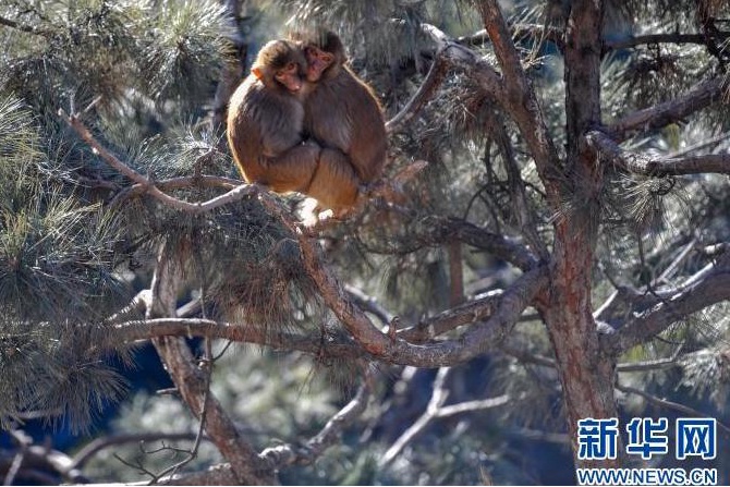 1月5日,在双滦区双塔山景区,两只猕猴在树上休息。