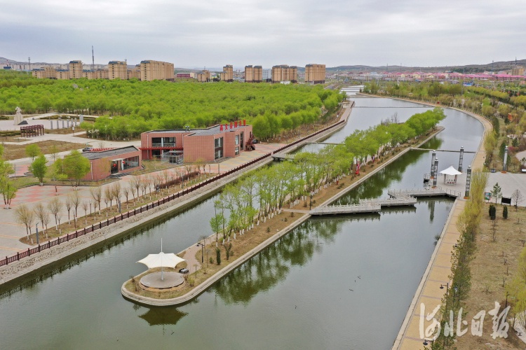 2021年5月12日拍摄的尚义县城区森林公园鸳鸯河畔的图书馆。