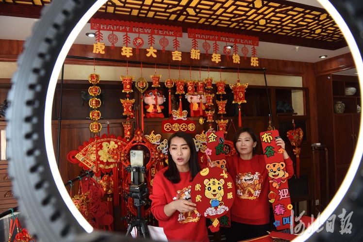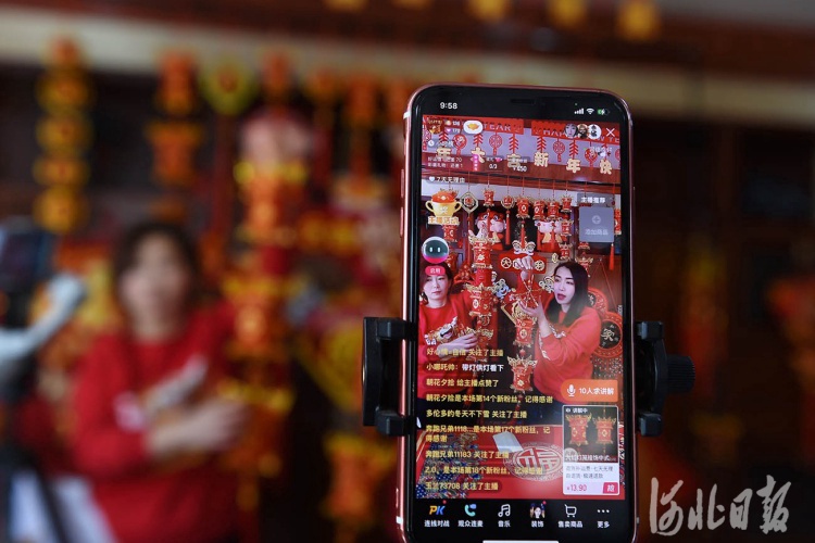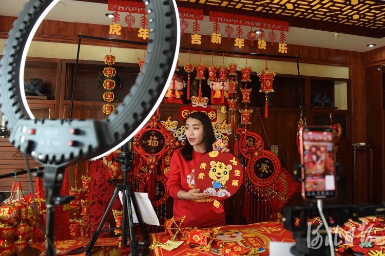 2021年12月29日,河北省南宫市安贝商贸有限公司电商工作人员在通过网络直播销售虎年毛毡饰品。