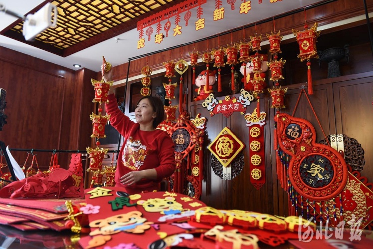 近年来,素有毛毡之乡之称的河北省南宫市,不断完善专项扶持发展政策,推动毛毡产业革新发展,全市已有毛毡企业920余家,毛毡产业链条日益完善,由过去单一生产毛毡材料,衍生出毛毡挂件、毛毡工艺品等100多个类别、1.8万个品种。“双节”临近,“萌虎”、灯笼、窗花、春联等毛毡挂件饰品订单纷至沓来,当地生产企业、网店开足马力对外供货。河北日报记者赵永辉摄影报道