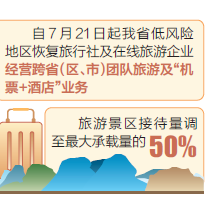 同时,调整旅游景区限量措施。旅游景区要继续贯彻落实“限量、预约、错峰”要求,接待游客量由不得超过最大承载量的30%调至50%。在严格落实各项防控措施的前提下,采取预约、限流等方式,开放旅游景区室内场所。