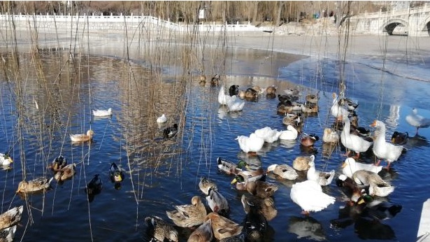 多年来负责画舫的工作人员姜师傅告诉记者,因为鸭鹅们来回划水,所以整个湖面独有这里的水没有结冰。他每天早晚两次投食,就足够鸭鹅们过一天一夜了。天暖和的时候,会有鸭鹅游到湖心岛的窝棚里栖息。但是现在冬天湖面结冰,天黑以后,大部分鸭鹅就在水边休憩。尽管太原天气冷到极值,除了游泳面积小了以外,鸭鹅们作息规律,没有受影响。