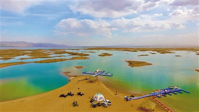 5月22日,航拍大美乌海湖。乌海湖,属于黄河水域的一部分,紧邻乌兰布和沙漠,形成世上罕见的“沙、海、山、城”共存共生的奇观,无需舟车劳顿就能饱览半湖“碧玉”半湖“金”的美景。