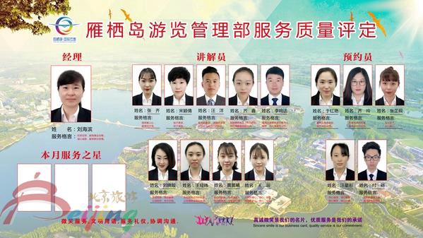 为了更好展示员工风采,彰显企业文化,设计制作了“雁栖岛游览管理部服务质量评定”展示板,将真诚微笑是我们的名片,优质服务是我们的承诺作为部门的服务标准,把全体工作人员照片、工作岗位、服务格言全部展示出来,同时设计制作服务质量评分卡,让游客根据员工的服务质量进行评定,日常工作中遵守公司和部门各项规章制度进行综合评定,每月评选出三名服务之星。