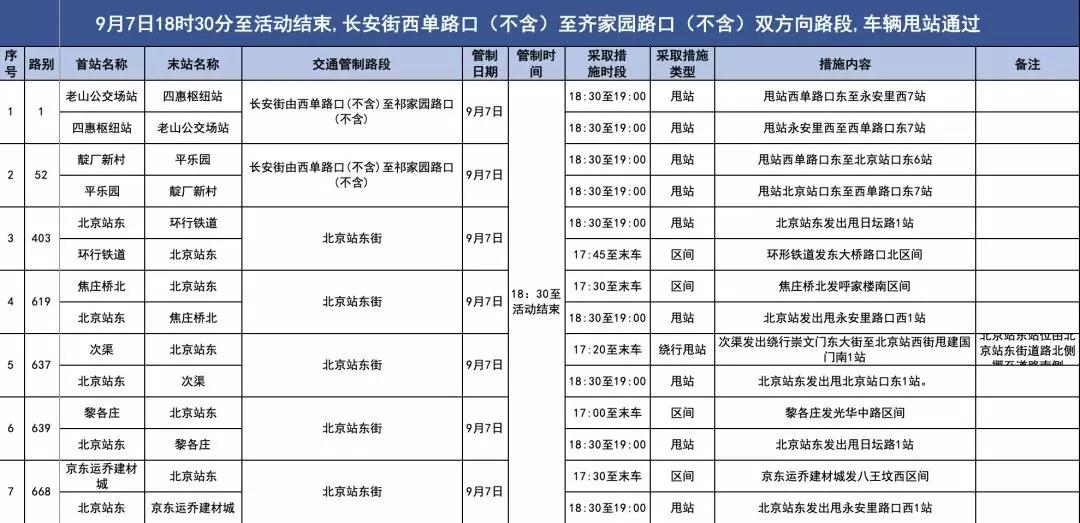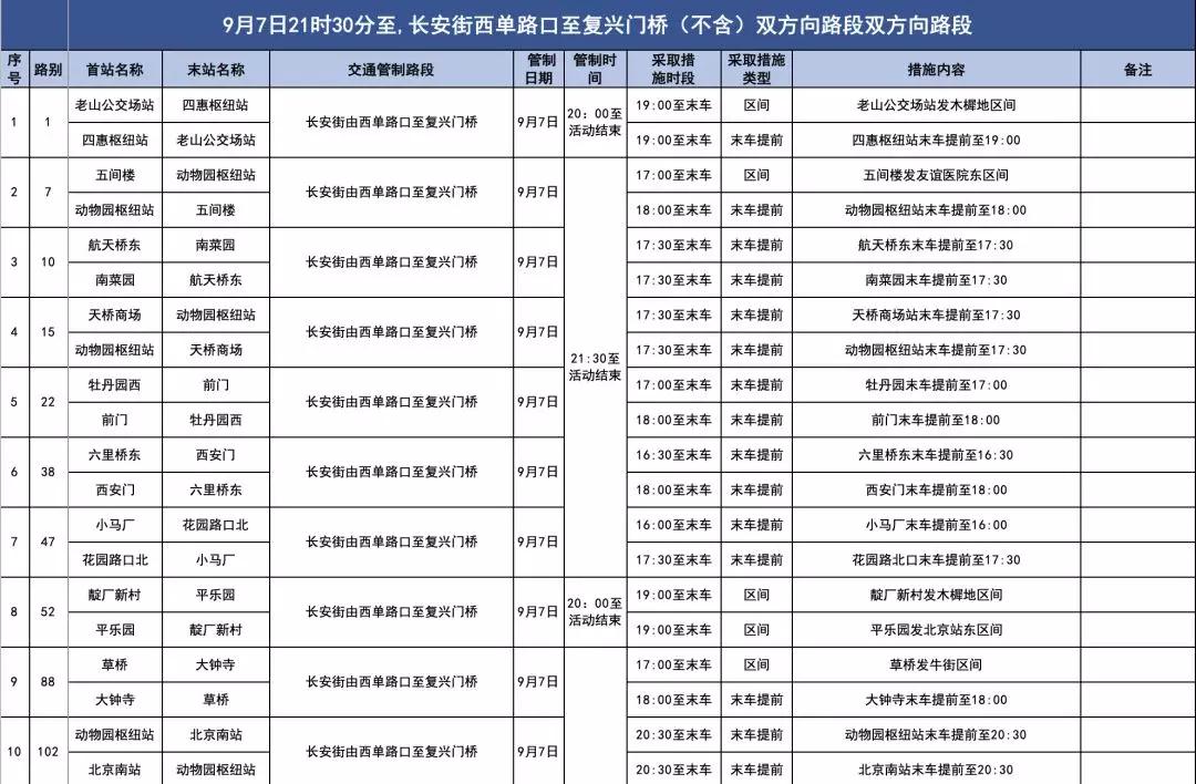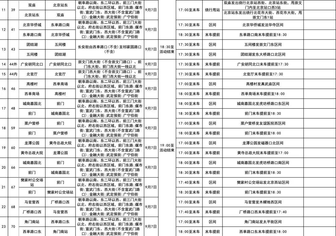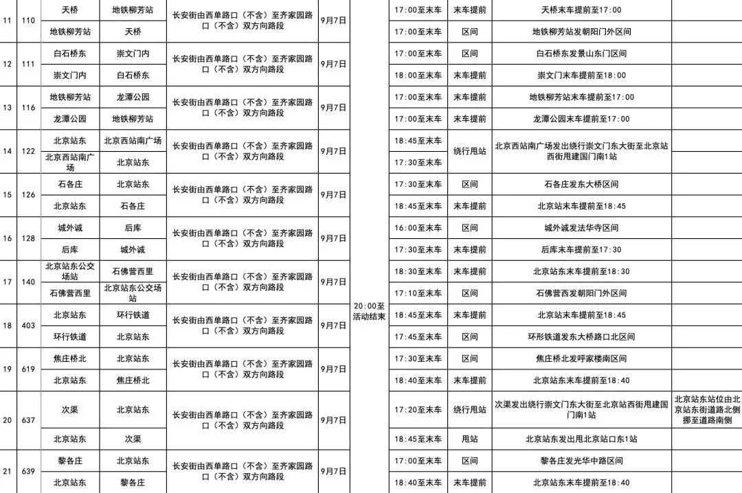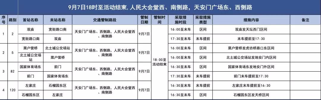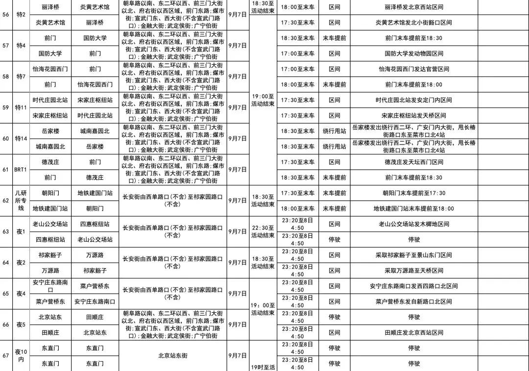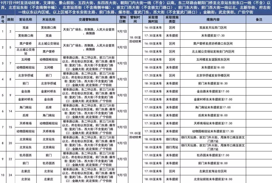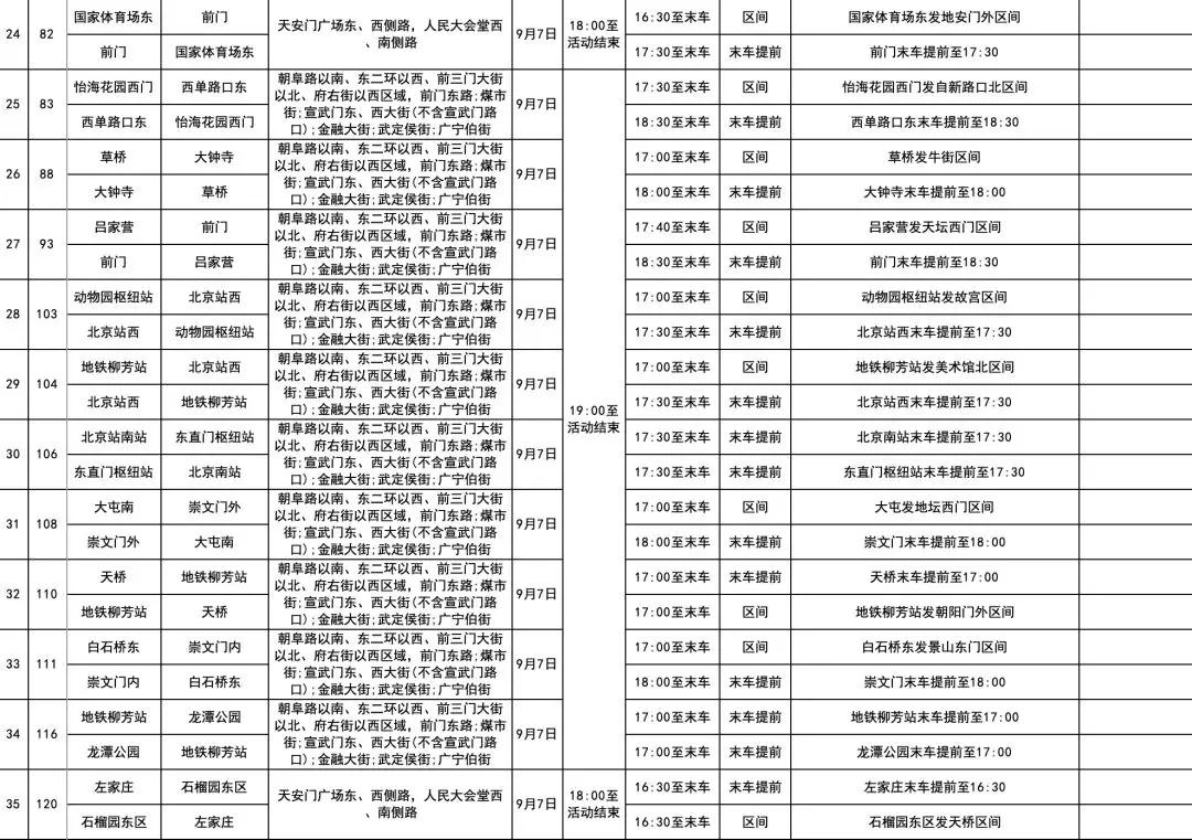 时间9月8日零时至6时40分(具体时间以现场交通管制结束时间为准),84条线路在交通管制期间将调整运营安排。其中,采取区间措施60条,绕行甩站措施8条,停驶措施16条。