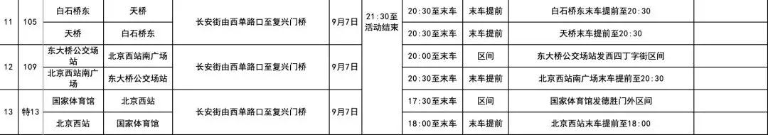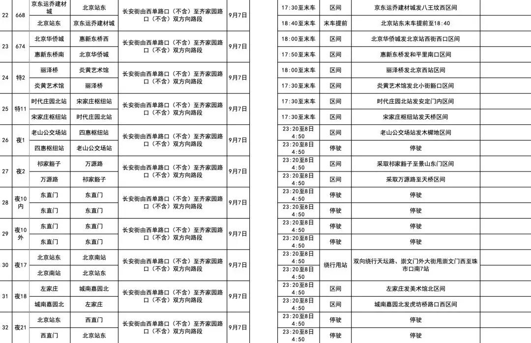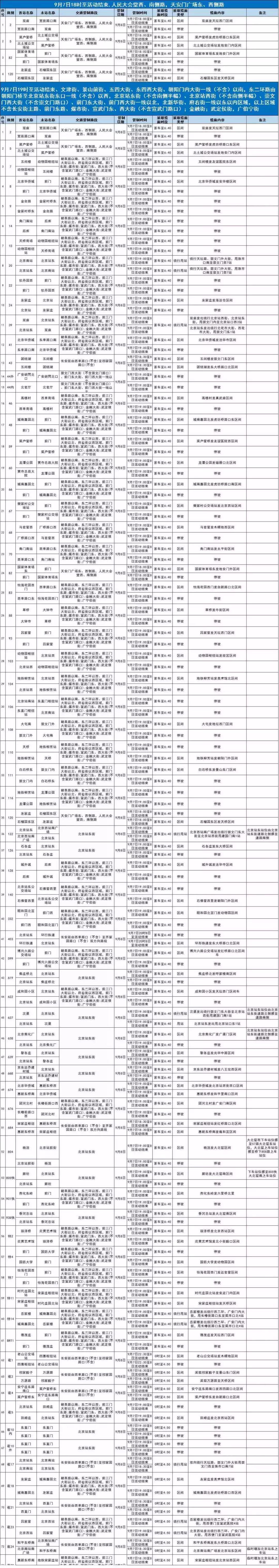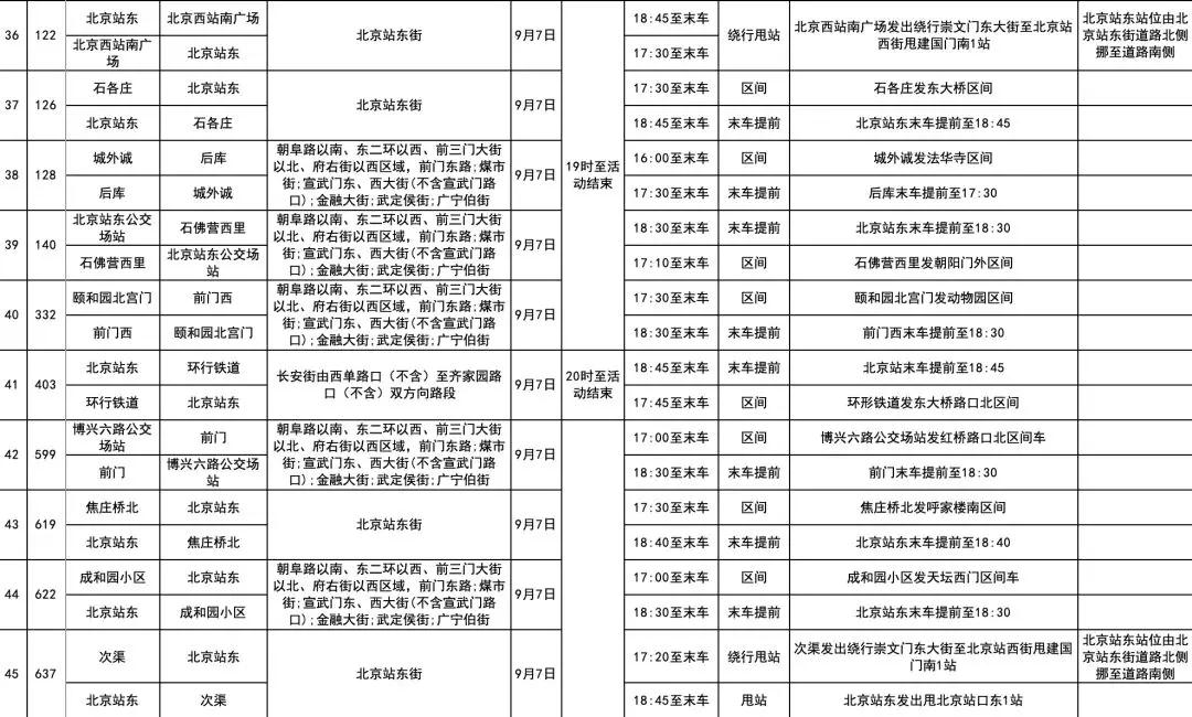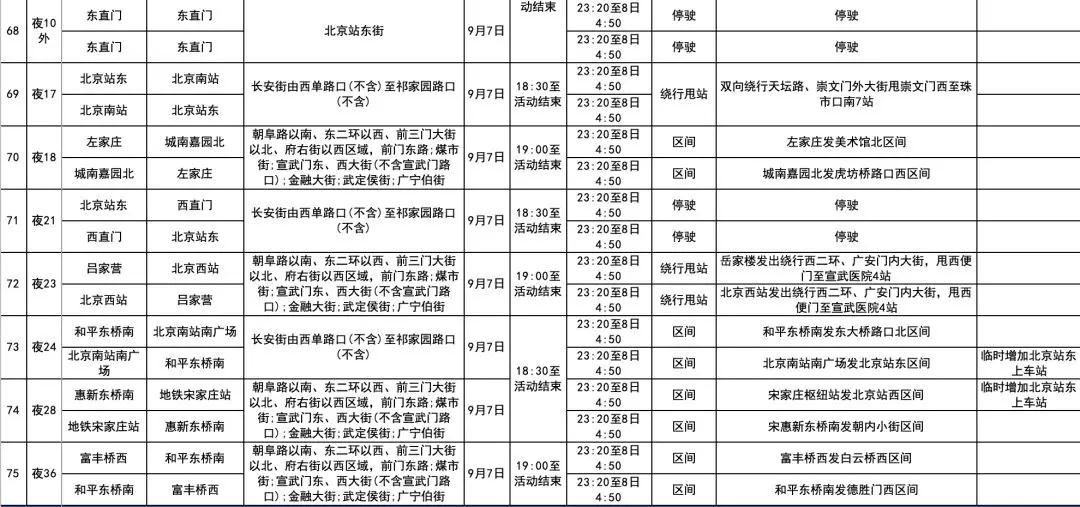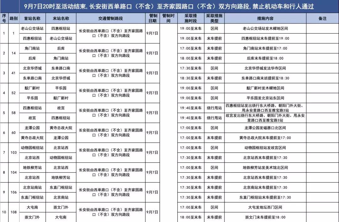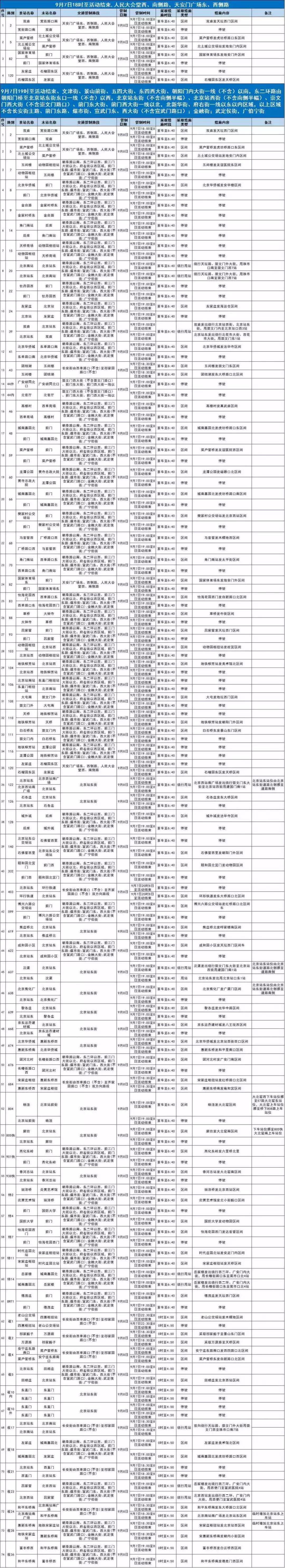 时间9月8日零时至6时40分(具体时间以现场交通管制结束时间为准),84条线路在交通管制期间将调整运营安排。其中,采取区间措施60条,绕行甩站措施8条,停驶措施16条。