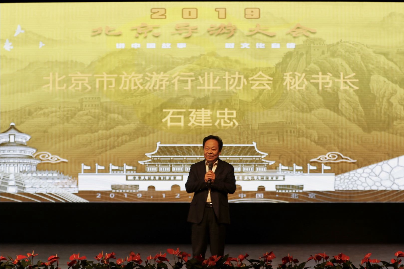 伴随着动人心弦、热情奔放的旋律,导游大会在大合唱《讲中国故事的追梦人》中拉开序幕,北京市旅游行业协会秘书长石建忠出席大会现场并发表了热情洋溢的致辞,他首先转达了北京市文旅局领导对大家的殷切希望及诚挚的问候。