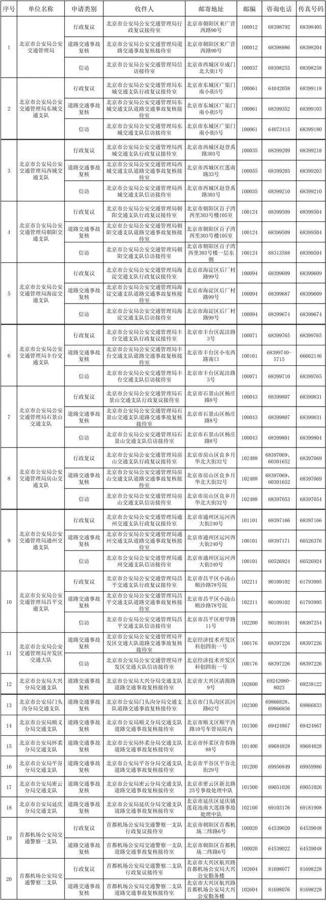 3.疫情防控期间,申请人申请行政复议、道路交通事故复核、信访的,可以通过邮寄的方式提出。各单位的邮寄地址、收件人、邮编等信息可在附表查询,在邮寄信封上或者邮件封套上请注明“行政复议申请”、“道路交通事故复核申请”或“信访申请”。申请人也可通过互联网北京市公安局公安交通管理局主页局长信箱反映诉求。