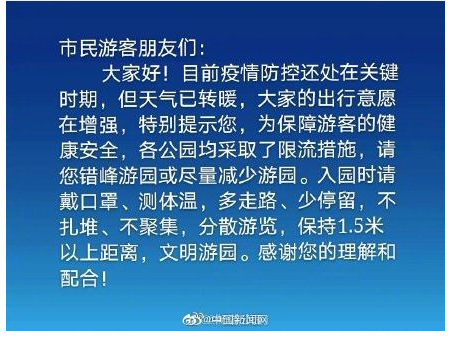 北京公园管理中心提示:请错峰游园或尽量减少游园