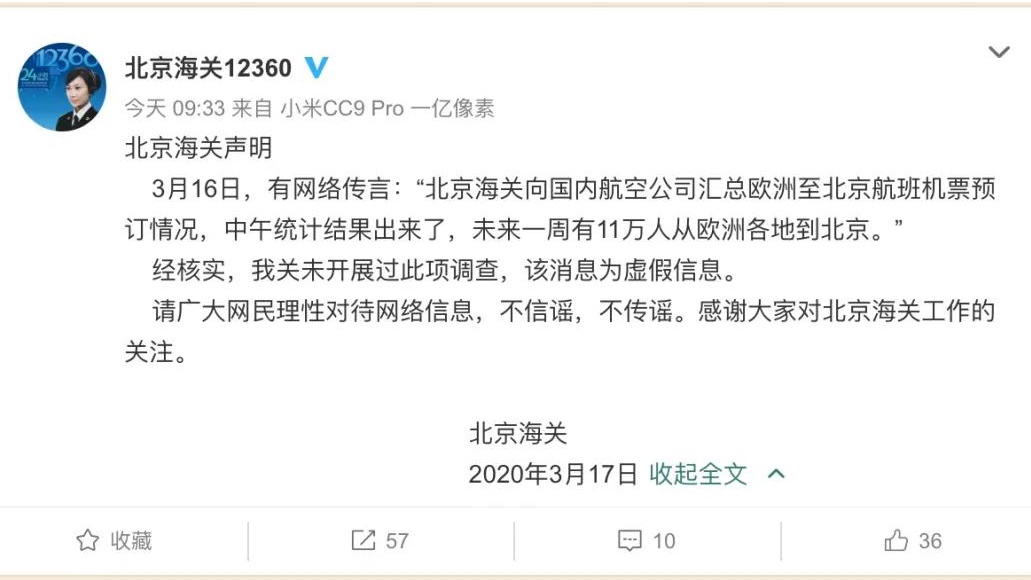 3月16日,有消息称“北京海关向国内航空公司汇总欧洲至北京航班机票预订情况,中午统计结果出来了,未来一周有11万人从欧洲各地到北京。”