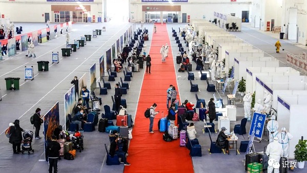 中国国际展览中心新馆自3月10日启用为入境人员集散点。入境人员抵达首都国际机场后,经过卫生检疫、体温检测、信息核录等流程,未出现发热、咳嗽等症状的集中送至新国展集散大厅,由省区市工作组转送分流。现场人流引导、信息登记、车辆转运等各项工作有条不紊进行,秩序井然。
