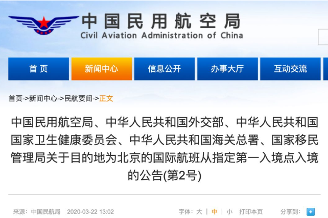 3月22日中午,中国民用航空局、中华人民共和国外交部、中华人民共和国国家卫生健康委员会、中华人民共和国海关总署、国家移民管理局发布了“关于目的地为北京的国际航班从指定第一入境点入境的公告(第2号)”。