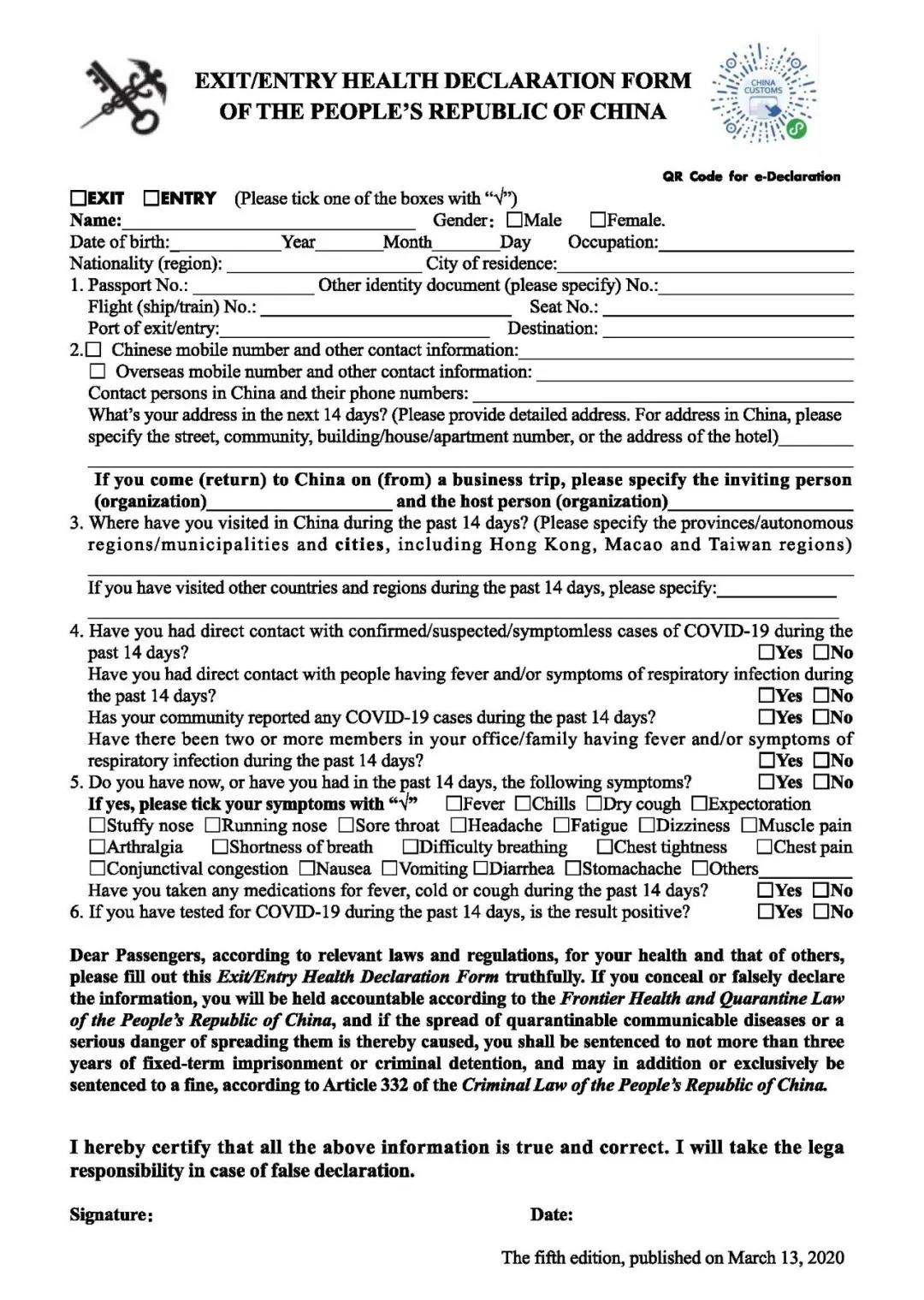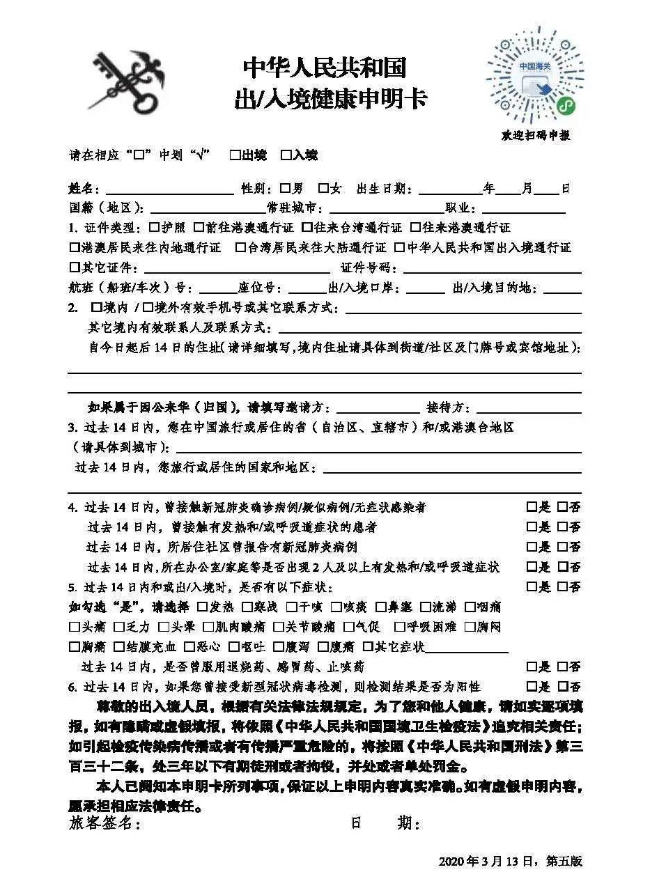 近日来,国内疫情得到有效控制,不断向好的趋势来之不易,而与此同时,全球疫情却不容乐观。中国以外多国疫情攀升,防止境外疫情输入成为当前疫情防控工作的重点,为了防控疫情跨境传播,根据口岸疫情防控形势和相关判定标准变化,海关总署印发了第五版《中华人民共和国出/入境人员健康申明卡》并于2020年3月17日正式启用。