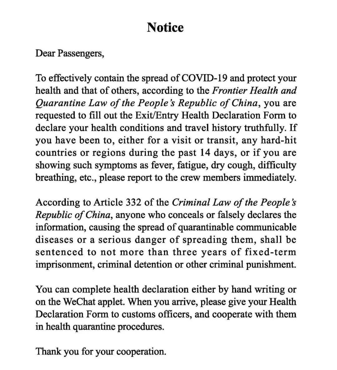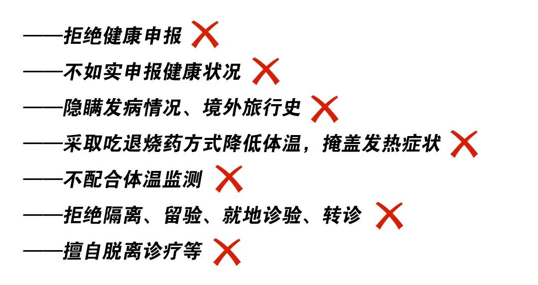 注:再次提醒广大出入境旅客,务必如实、完整、准确填报健康申明卡,并配合海关做好体温监测、医学巡查、流行病学调查、医学排查等卫生检疫措施。切忌采取下列行为逃避国境卫生检疫,如: