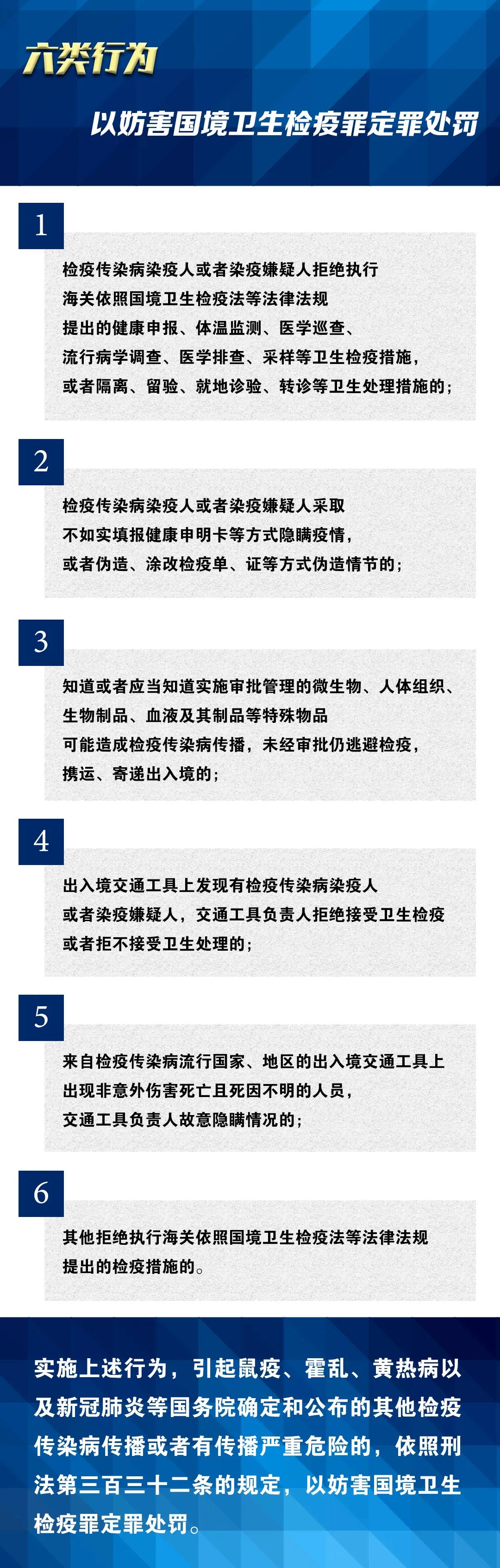 海关提醒:根据日前,最高人民法院、最高人民检察院、公安部、司法部、海关总署联合发布的《关于进一步加强国境卫生检疫工作 依法惩治妨害国境卫生检疫违法犯罪的意见》,除强调进一步加强国境卫生检疫行政执法工作外,还明确了刑法第三百三十二条规定的“妨害国境卫生检疫罪”有关法律适用问题。