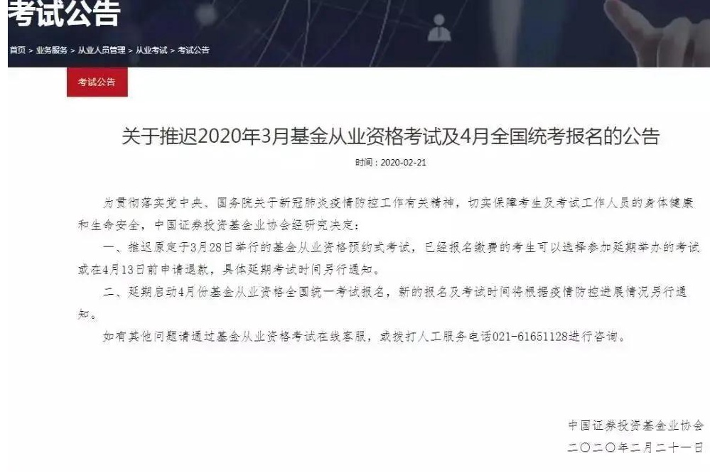 3.2020年3月基金从业资格考试及4月全国统考报名推迟